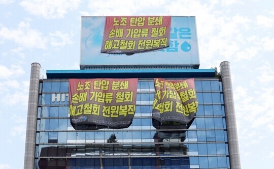 | 서울 강남구 하이트진로 본사 옥상에 전국민주노동조합총연맹(민주노총) 공공운수노조 화물연대 소속 조합원들의 요구가 쓰인 대형현수막이 걸려있다. (사진=연합뉴스) |