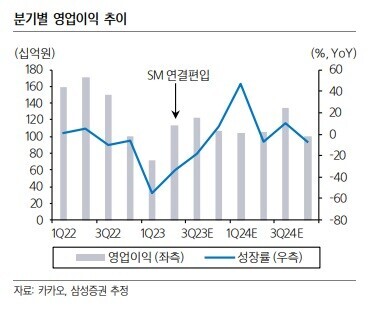 인수한 에스엠은 앨범 판매 호조로 매출과 영업이익이 전분기 대비 각각 700억원, 150억원 증가가 예상된다. 그러나 구조조정 관련 퇴직금 200억원 발생과 AI 투자 및 에스엠 인수 관련 상각비 증가로 영업이익은 18.6% 감소한 1223억원에 그칠 것으로 봤다 .