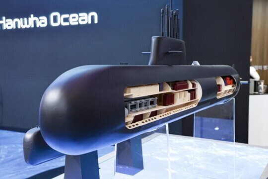 | 6월 7일 부산 벡스코에서 열린 국제해양방위산업전(MADEX) 내 한화오션 부스에 전시된 장보고-III 모형. (사진=한화오션) |