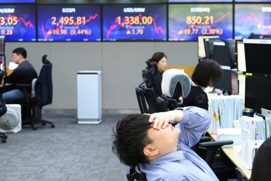 | 27일 서울 중구 하나은행 딜링룸에서 한 직원이 장 장료 후 피곤한 듯 눈을 만지고 있다. (사진=연합뉴스) |