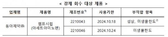 | 동아제약 강제 회수 대상 제품. (자료=삭약처) |