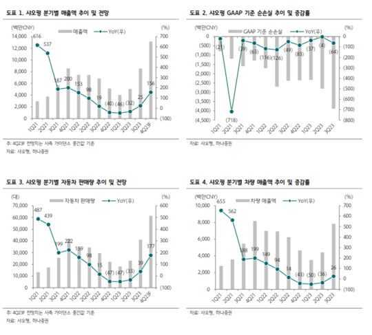 한수진 하나증권 연구원은 "G9 페이스리프트 모델 판매량이 본격적으로 반영된 10월에 전체 월간 판매량이 2만대로 서프라이즈한 수치를 기록한 점을 감안하면 4분기 판매량 가이던스는 높아진 기대치에 부합한 수준"이라며 "샤오펑은 4분기부터 유의미한 실적 개선이 나타날 것"이라고 판단했다.