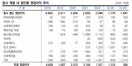 | 이마트 계열 내 법인별 영업이익 추이. (자료=한신평) |