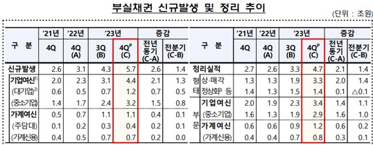 지난해 4분기 중 신규로 발생한 부실채권은 5조7000억 원으로 전분기 대비 1조4000억 원 증가했다.