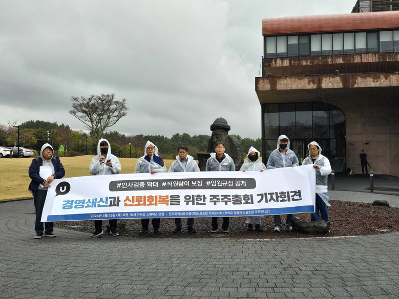 노조는 28일 카카오 정기 주주총회가 열린 카카오 본사 제주 스페이스닷원 앞에서 기자회견을 열었다.