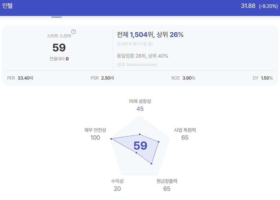 빅 데이터에 기반한 미국 기업 분석 전문 사이트인 초이스스탁에 따르면, 인텔의 종목진단 점수(스마트스코어)는 59점이다. 이는 미국 전체 상장사 5591개 평가 기업 중 1504위로 분석됐다.
