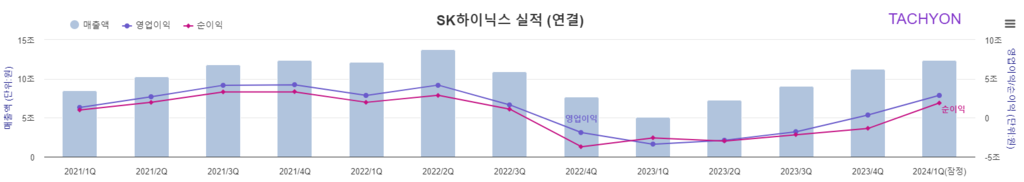 26일 인공지능공시분석 프로그램 타키온월드에 따르면 SK하이닉스는 1분기 잠정실적으로 매출은 12조4300억원, 영업이익으로 2조8900억원을 각각 거뒀다고 25일 공시했다.
