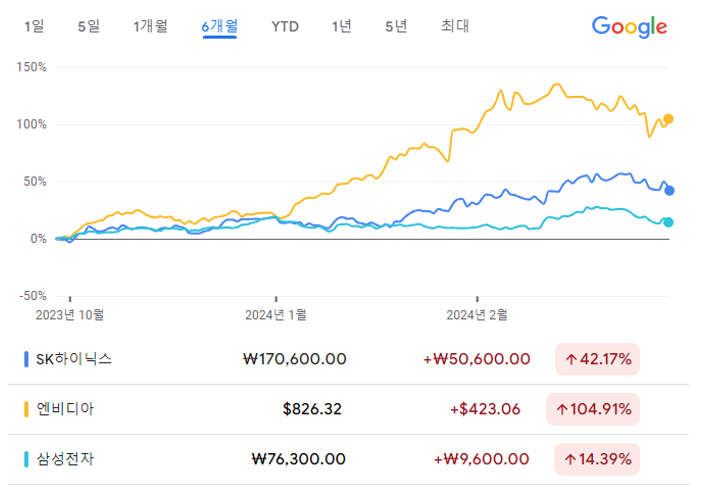 지난 6개월 수익률은 25일 종가 기준으로 SK하이닉스는 42.17%, 엔비디아는 104.91%, 삼성전자는 14.93%를 각각 기록했다.