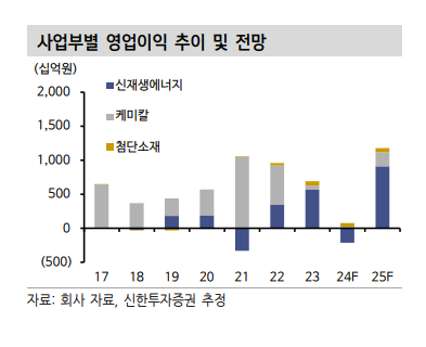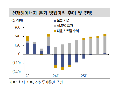 이진명 신한투자증권 연구원은 "상반기 태양광 사업을 둘러싼 어려운 대외환경과 케미칼 약세 영향으로 올해 영업적자가 불가피하겠다"면서도 "다만 하반기 신재생에너지에서 미국 태양광 신규 설비(솔라 허브) 가동에 따른 AMPC 증가와 경쟁력 강화(수직계열화)가 기대된다"고 말했다.
