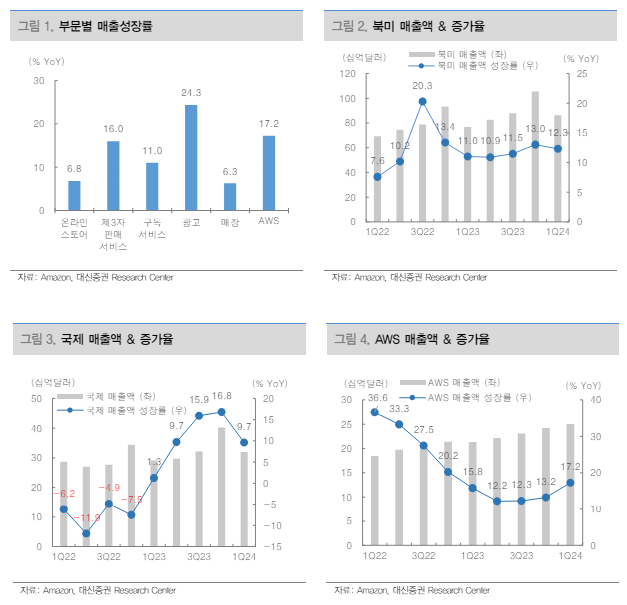 아마존의 2024년 1분기 매출액은 1433억 달러로 전년 대비 12.5% 증가하며 컨센서스를 0.5% 상회했다. 영업이익은 153억 달러로 220.6% 급증하며 컨세서스를 35.9% 웃돌았다.주당순이익(EPS)은 0.98달러로 예상치를 역시 16.4% 뛰어넘었다.