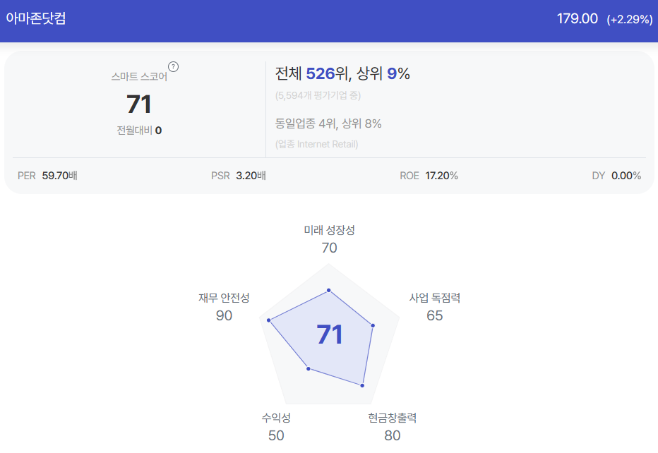 빅 데이터에 기반한 미국 기업 분석 전문 사이트인 초이스스탁에 따르면, 아마존닷컴의 종목진단 점수(스마트스코어)는 71점이다. 이는 미국 전체 상장사 5594개 평가 기업 중 526위로 분석됐다.