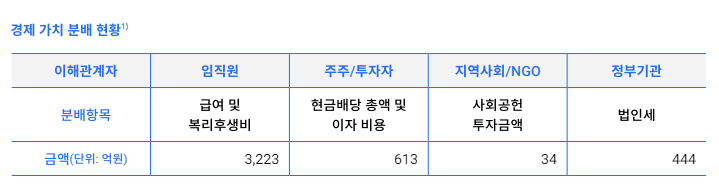 이중 임직원 급여 및 복리후생비가 3223억원으로 대부분을 차지했고, 주주 현금 배당 및 이자 비용으로 613억원, 법인세 444억원을 분배했다. 이 외에 사회공헌은 34억원에 그쳤다. 고정비 외에 사회공헌 비용은 여전히 미미한 수준이다.