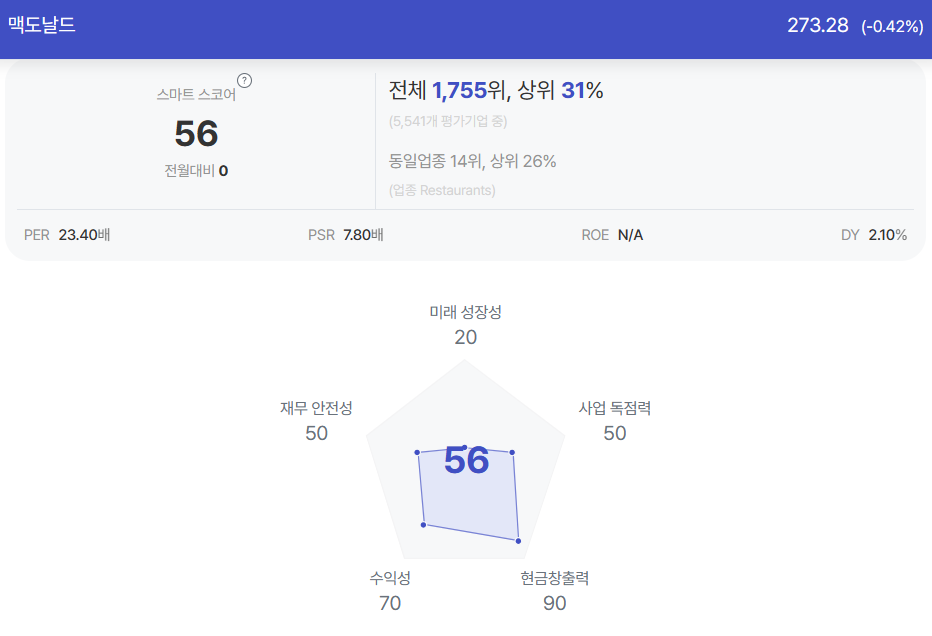빅 데이터에 기반한 미국 기업 분석 전문 사이트인 초이스스탁에 따르면, 맥도날드의 종목진단 점수(스마트스코어)는 56점이다. 이는 미국 전체 상장사 5541개 평가 기업 중 1755위로 분석됐다.