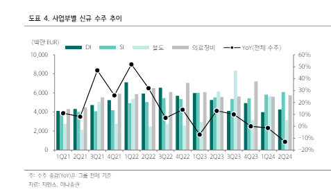 하나증권에 따르면, 지멘스의 회계연도 2024년 2분기(3월 결산) 신규 수주는 236.4억 유로로 전년 대비 12% 감소하며 시장 컨센서스를 소폭 상회했으나 매출액 194.2억 유로, 순이익은 25.8억 유로로 컨센서스를 각각 1%와 6% 하회했다.