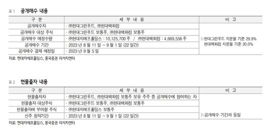 공개 매수가 예정대로 진행되면 현대지에프홀딩스는 현대그린푸드 지분 40%, 현대백화점 지분 32%를 각각 확보해 최대주주에 오르게 된다.