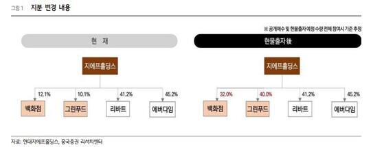 박종렬 흥국증권 연구원은 "현대백화점의 지주회사 전환은 무산됐고, 현대그린푸드만 지주사로 전환되어 그룹 지배구조 개편의 불확실성이 존재하고 있었다"며 "기존 구조에서는 현대지에프홀딩스가 지주회사 요건 충족을 위해 2년 이내에 현대백화점에 대한 보유 지분 12.1%를 처분해야 했는데, 현대백화점까지 현물출자에 참여함으로써 현대지에프홀딩스와 현대백화점 두 회사 모두의 리스크 요인이 해소됐다"고 말했다.
