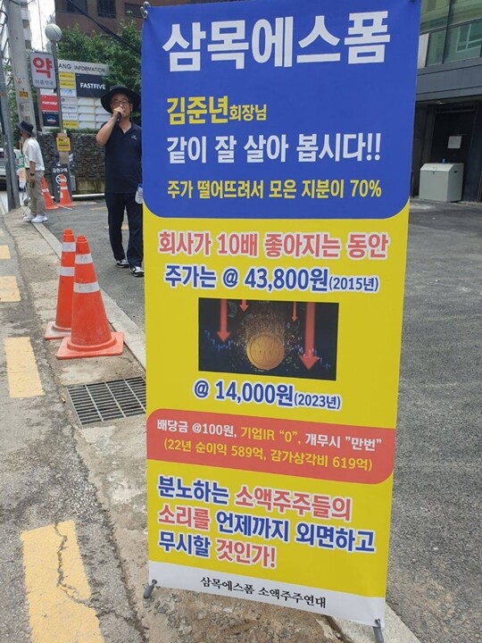 19일 한투연 등에 따르면 삼목에스폼 소액주주 연대는 김준년 삼목에스폼 회장과 삼목에스폼 등을 상대로 주주환원 정책·거버넌스 선진화 등 다각적인 협의를 요청했지만 묵살당하자 삼목에스폼 본사 앞에서 1인 시위 등 행동에 나섰다.