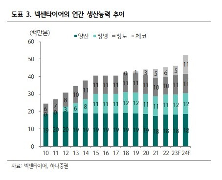 정용진 신한투자증권 연구원은 "업황 개선을 넘은 본격적인 성장세는 내년 체코 2공장 램프업으로 기반으로 시작된다"며 "기존 550만본에서 2배 늘어난 규모인 1100만으로 확장되며 프리미엄 제품인 고인치·올웨더 타이어 현지화 비중이 높아져 현지 기반을 통한 프리미엄 제품 확대 전략은 수익성 개선의 축이 될 수 있다"고 설명했다.